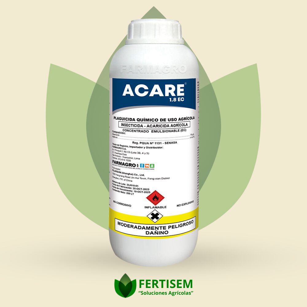 Acare es un acaricida de alta eficacia para el control de ácaros e insectos en diversos cultivos agrícolas. Su ingrediente activo, la abamectina (18 g/L), pertenece al grupo químico de las avermectinas y se obtiene de forma natural del microorganismo Streptomyces avermitilis. Gracias a su formulación en concentrado emulsionable, Acare garantiza una acción rápida, duradera y segura en el manejo integrado de plagas.